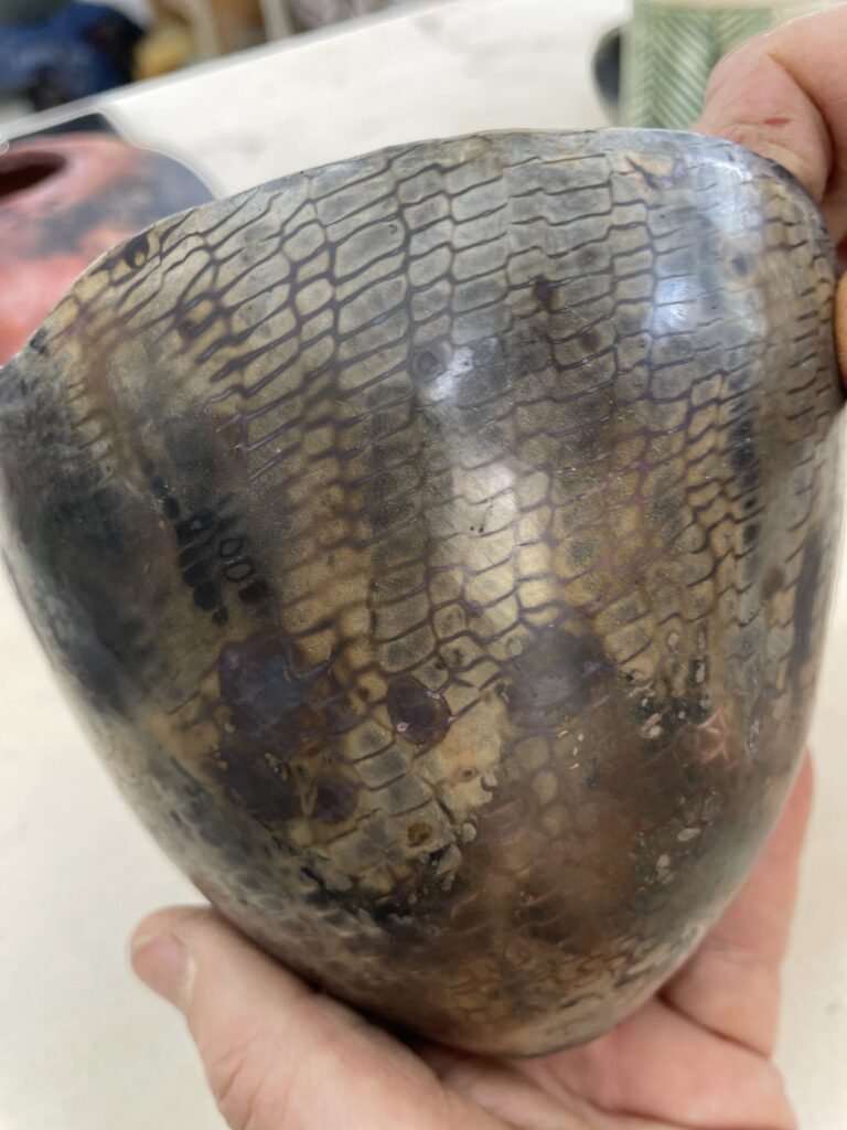 In this workshop you will decorate your pots with a special slip and wax resist if you want to add a decorative element. We will pack the raku kiln and fire it. You can bring two burnished pots for this firing. The finished pots have a lovely satin sheen finish.